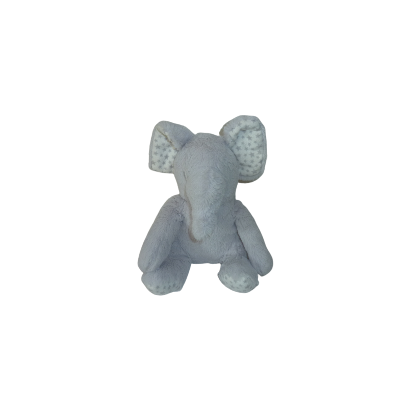 Doudou peluche éléphant 32 cm environ position assise, gris motif étoiles. Etat : Comme neuf (étiquette de la marque coupée)