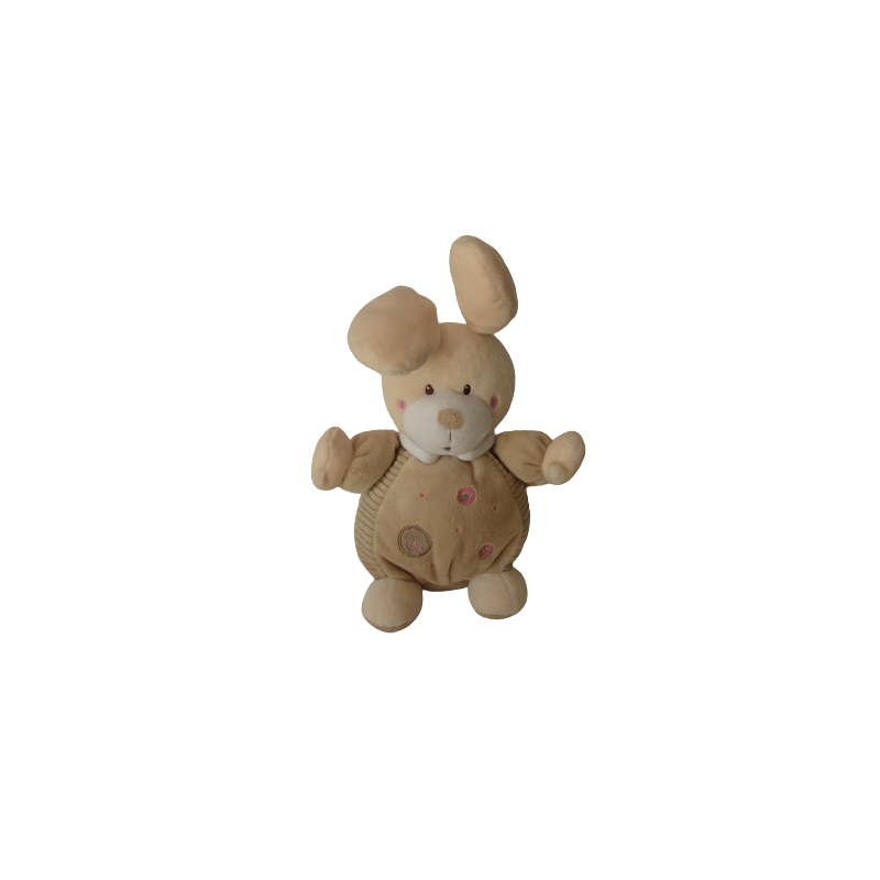 Doudou peluche lapin 22 cm environ sans compter les oreilles, marron motif ronds. Etat : Excellent étatRecipient :