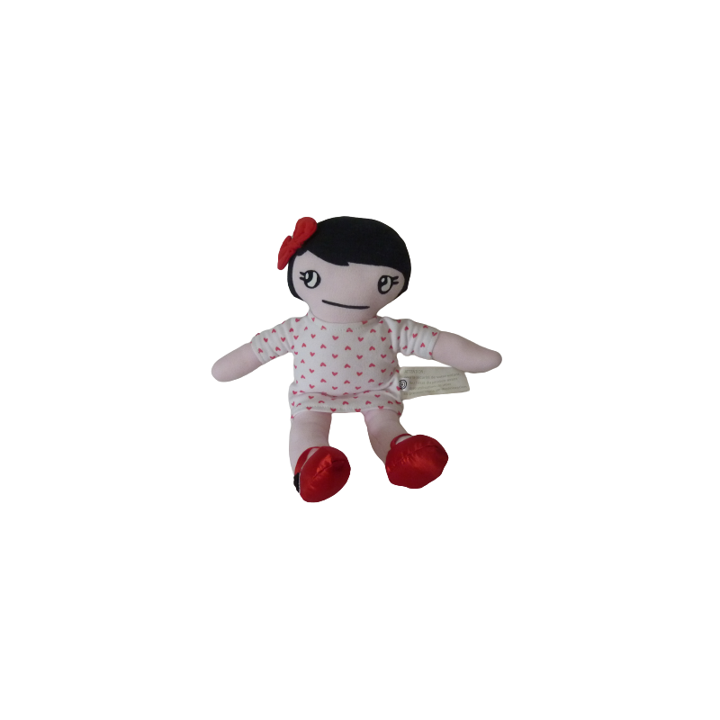 Doudou peluche poupée fille 27 cm environ, rose robe motif coeurs. Etat : Comme neuf (encore l'attache étiquette boutique)Recipient :