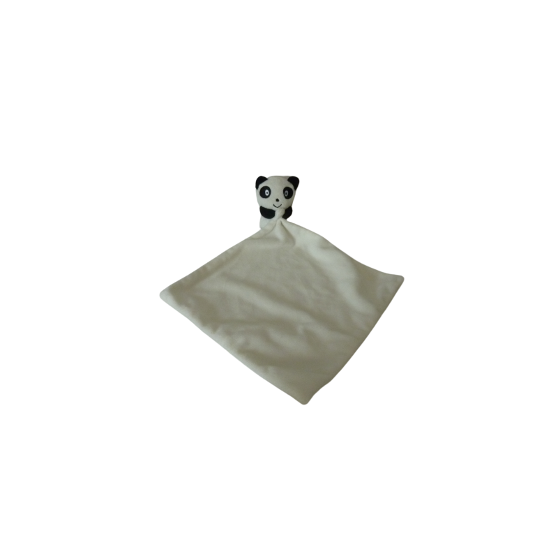 Doudou peluche panda blanc noir 10 cm environ, grelot, mouchoir blanc 25x25 cm environ. Etat : Comme neuf (étiquette de la marque coupée)