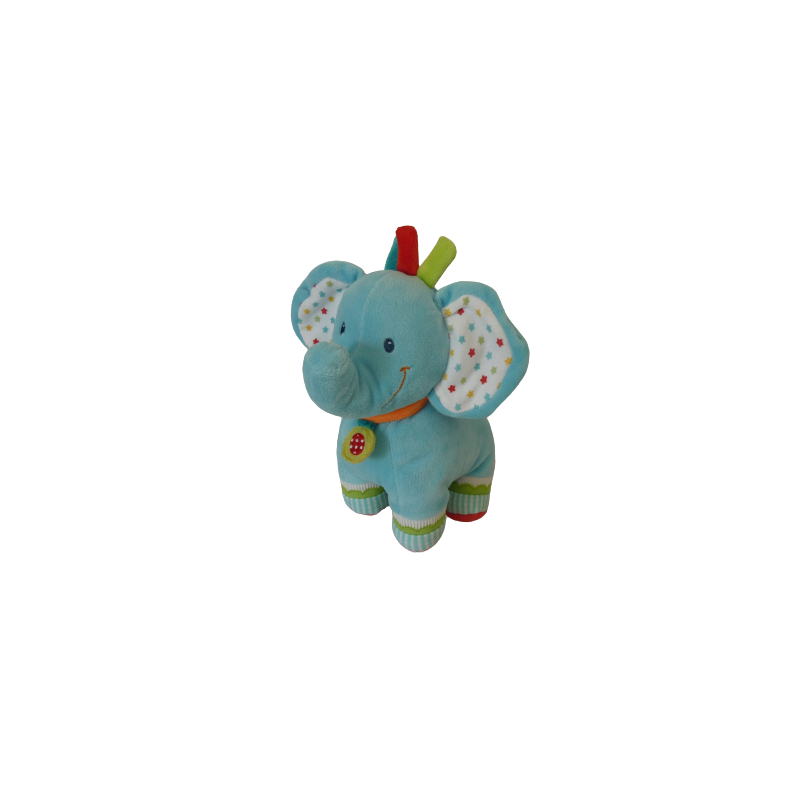 Doudou peluche éléphant 25 cm environ de hauteur tout compris, bleu et multicolore motif étoiles, anneau rouge forme étoile au bout de la queue. Etat : Comme neufRecipient :