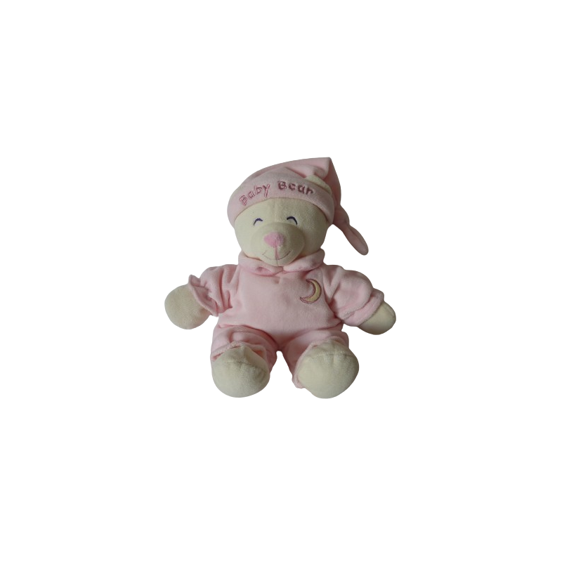 Doudou peluche ours Baby Bear 28 cm environ sans compter le bonnet, rose motif lune, Baby Bear Brodé. Etat : Comme neuf