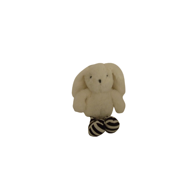 Doudou peluche lapin 30 cm environ sans compter les oreilles, blanc rayures blanc noir aux jambes. Etat : Comme neufRecipient :