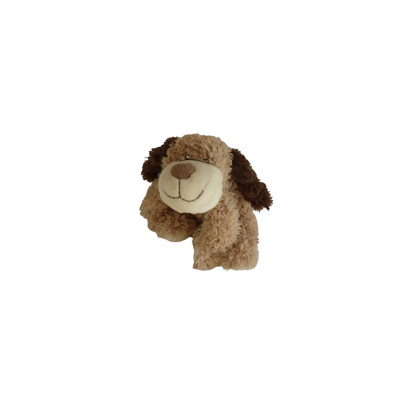 Doudou peluche chien 33 cm environ (mesures prises allongé des pattes avant jusqu'au pattes arrières), billes dans le corps et pattes, marron clair, marron foncé écru tissu forme coeur sur le dos. Etat : Comme neuf