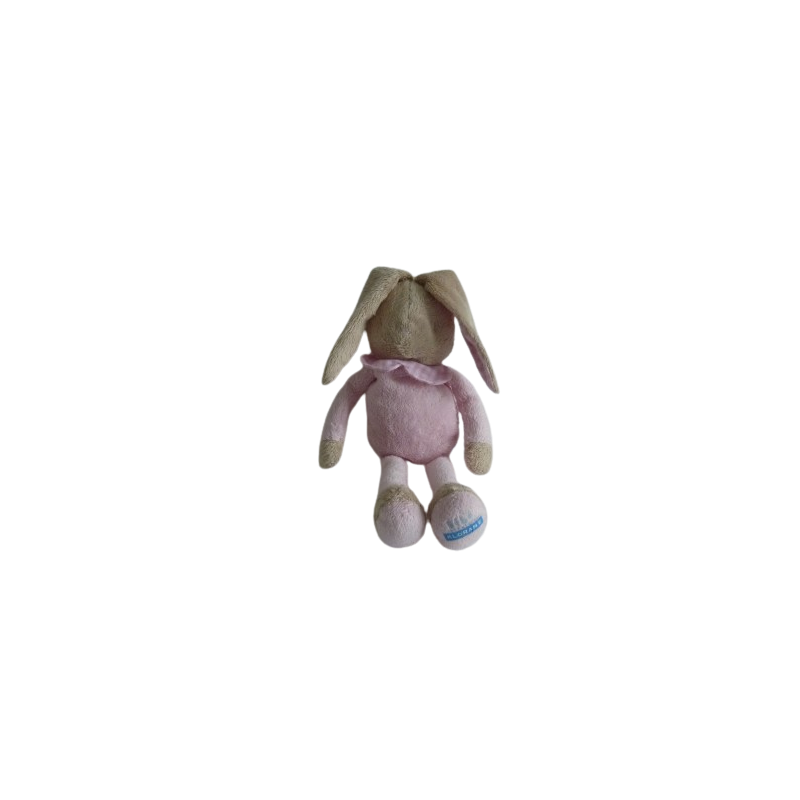 Doudou peluche lapin 27 cm environ sans compter les oreilles, rose intérieur des oreilles et collerette vichy rose blanc. Etat : Bon état (petit accroc sur une oreille), idéal doudou de secours