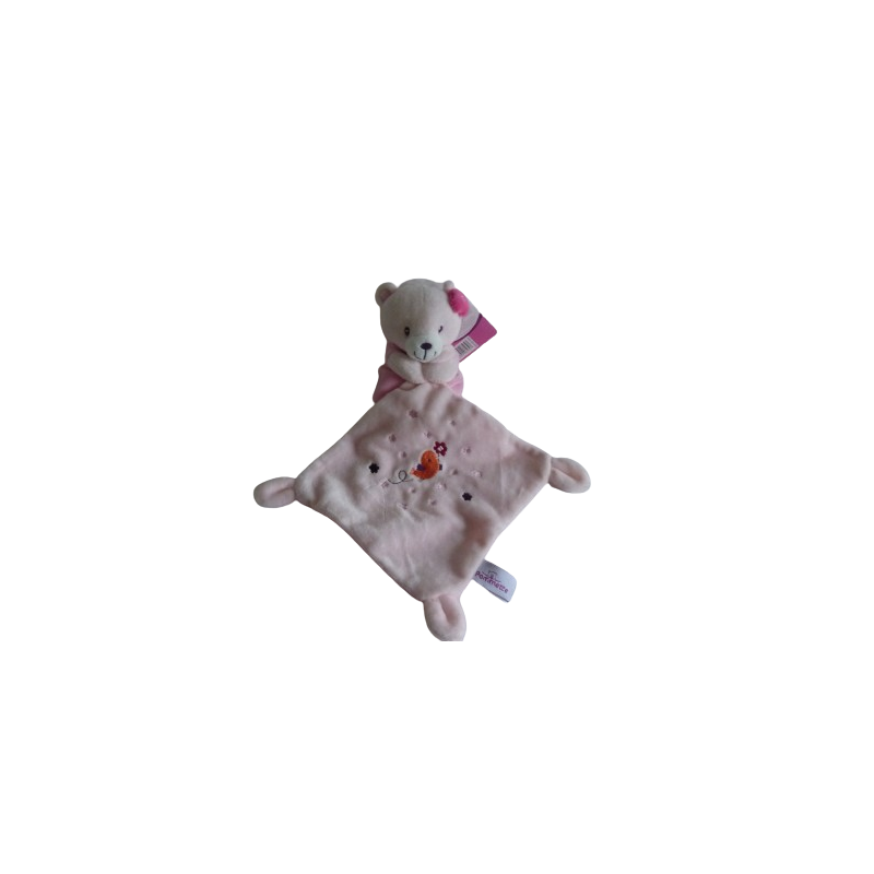 Doudou peluche ours 17 cm environ rose, mouchoir : 17x17 cm environ, rose motif oiseau fleur étoiles. Etat : NeufRecipient :