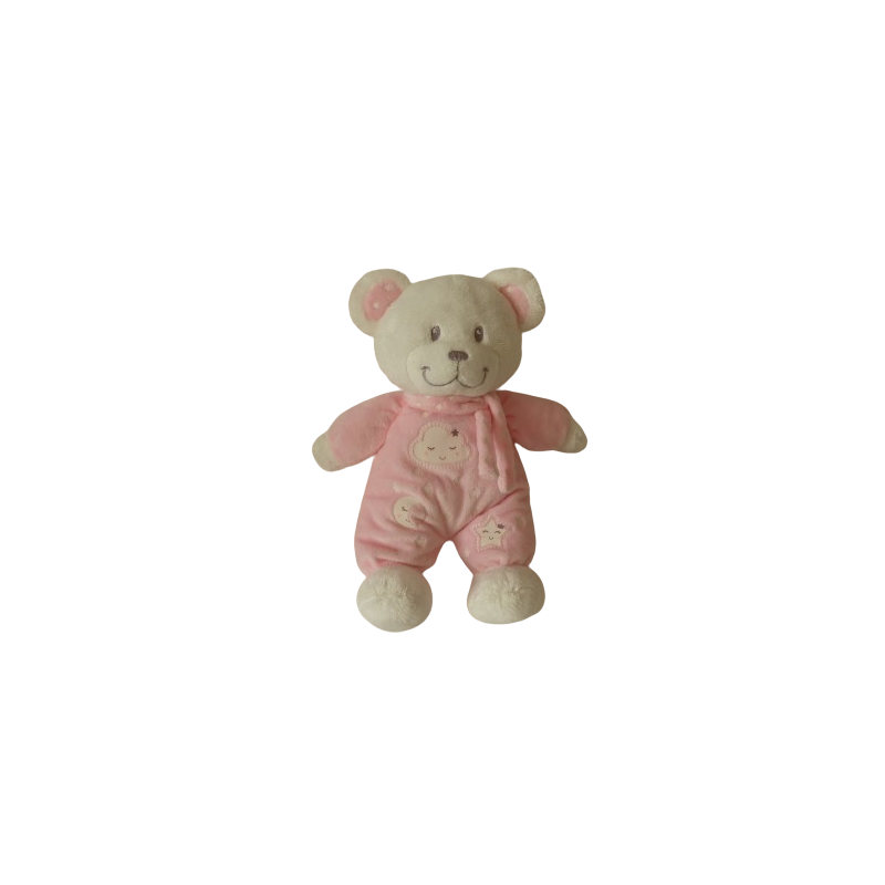 Doudou peluche ours 29 cm environ, rose motif nuage étoiles lune. Etat : Comme neuf