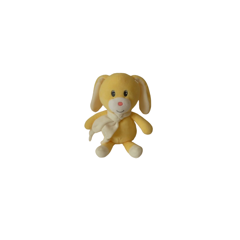 Doudou peluche lapin 27 cm environ sans compter les oreilles, jaune blanc nez rose. Etat : Comme neuf (étiquette de la marque coupée)Recipient :