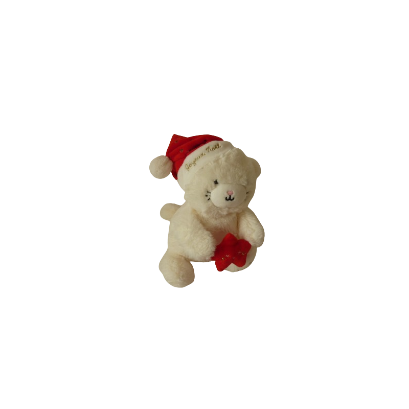Doudou peluche chat écru blanc 22 cm environ (jambes tendues), tient une étoile rouge et porte un bonnet de Noël à grelot avec brodé or Joyeux Noël, empreinte de pattes brodée or sous les pattes. Etat : Comme neufRecipient :