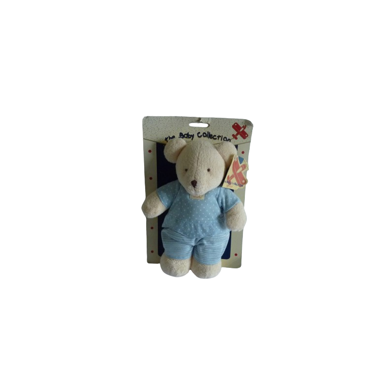 Doudou peluche ours 28 cm environ, marron bleu. Etat : NeufRecipient :