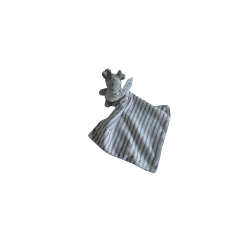 Doudou peluche mouchoir girafe 14 cm environ écru gris, mouchoir : 25x25 cm environ, rayures blanc gris écru au verso. Etat : NeufRecipient :