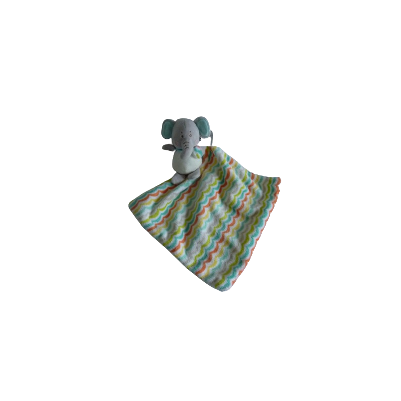 Doudou peluche mouchoir éléphant gris blanc turquoise 13 cm environ, mouchoir : 24x24 cm environ blanc motif vagues multicolores. Etat : NeufRecipient :