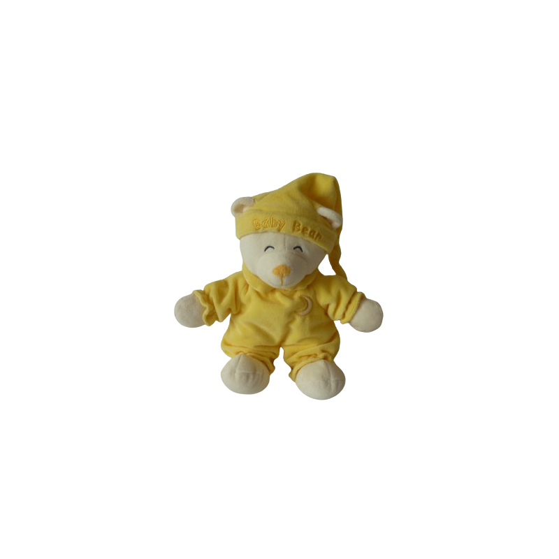 Doudou peluche ours 28 cm environ sans compter le bonnet, écru jaune motif étoile, Baby Bear brodé sur le bonnet. Etat : comme neuf