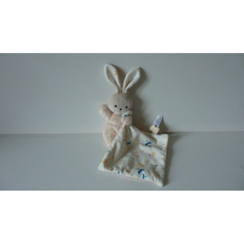 Doudou peluche lapin 23 cm environ oreilles comprises, beige motifs, mouchoir 14x14 cm environ, beige motifs. Etat : Comme neuf