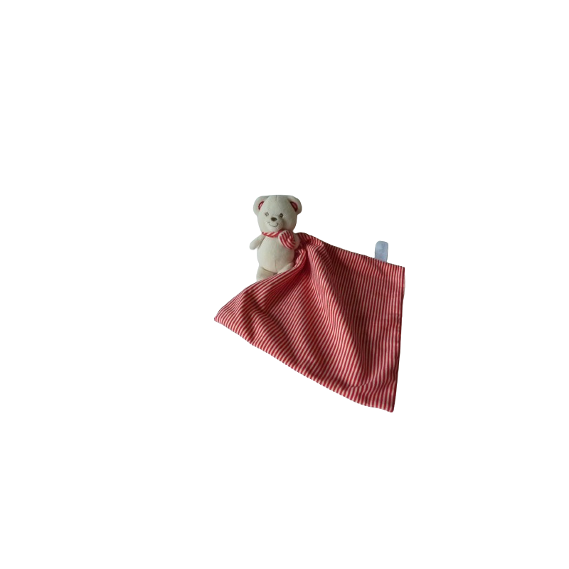 Doudou peluche ours 13 cm environ écru rayures rouges, mouchoir 24x24 cm environ, rayures rouge écru et blanc au verso. Etat : Comme neuf