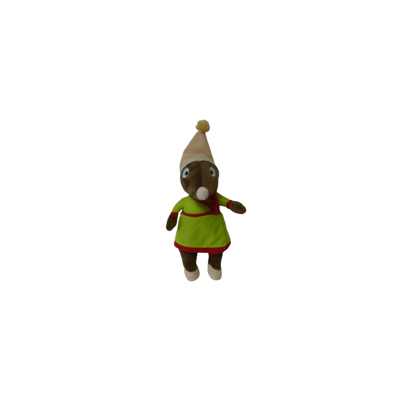Doudou peluche loup 25 cm environ sans compter le bonnet, marron peignoir vert rouge bonnet rose. Etat : Comme neuf (etiquette marque coupée)
