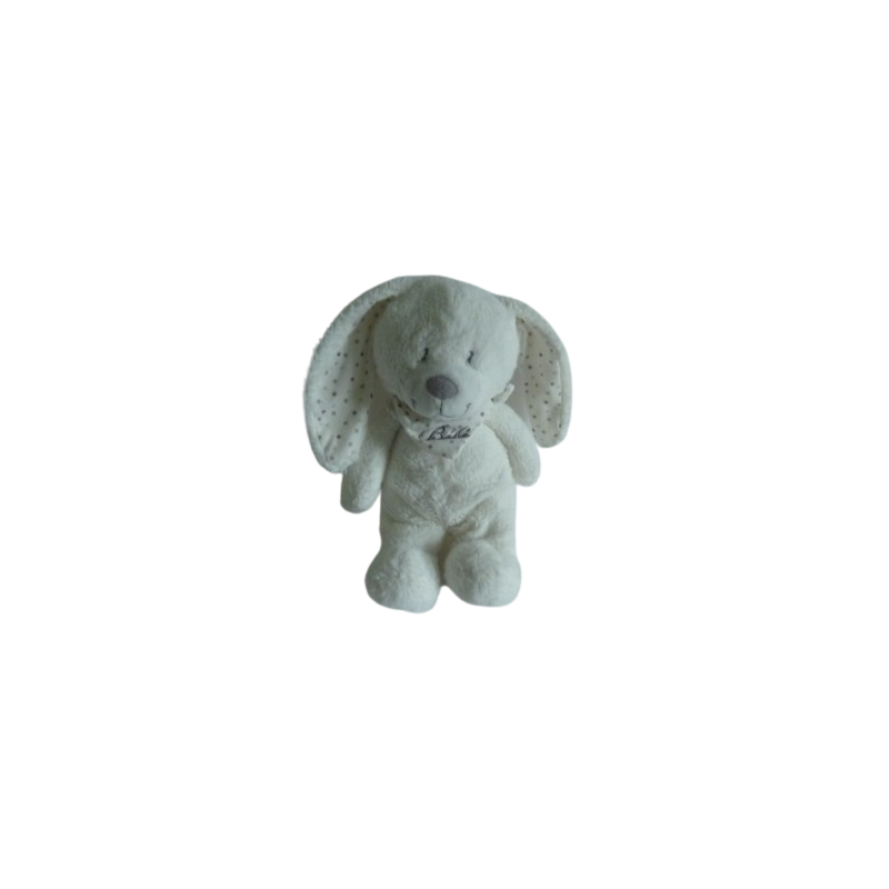 Doudou peluche lapin 26 cm environ, blanc motif pois à l'intérieur des oreilles et écharpe, Bébé brodé sur l'écharpe. Etat : Parfait étatRecipient :