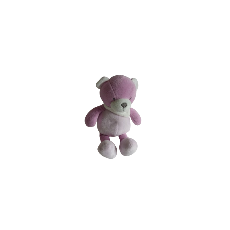 Doudou peluche ours 29 cm environ, rose, écharpe blanche. Etat : Comme neuf (étiquette marque coupée)Recipient :