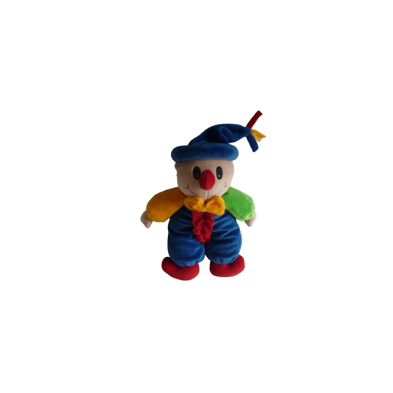 Doudou peluche clown 33 cm environ sans compter le bonnet, multicolore. Etat : Comme neuf