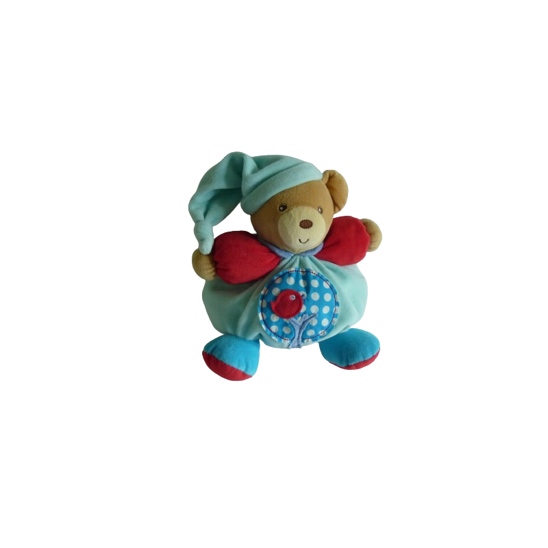 Doudou peluche boule ours 26 cm environ sans compter le bonnet, grelot, bleu rouge motif arbre oiseau. Etat : Très bon état
