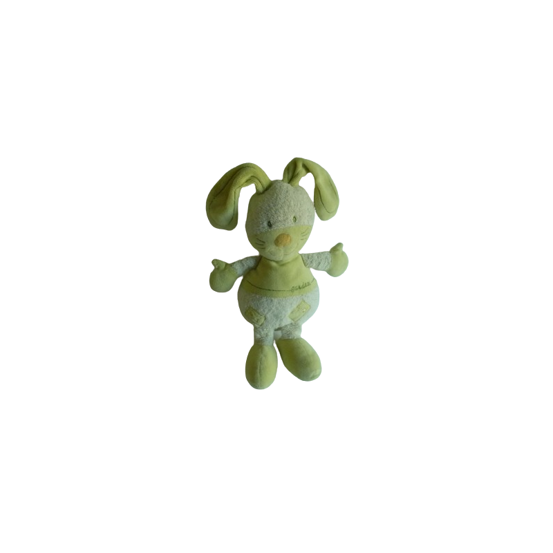 Doudou peluche lapin 32 cm environ sans compter les oreilles, écru vert. Etat : Bon état idéal 2ème doudouRecipient :