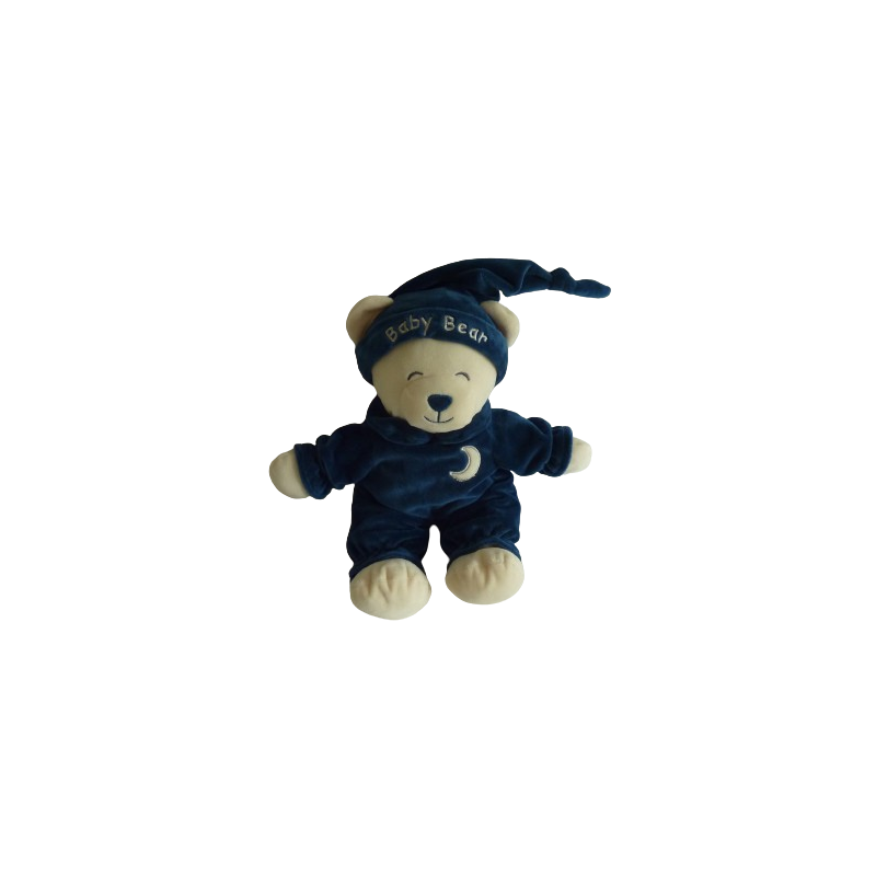 Doudou peluche ours 30 cm environ sans compter le bonnet, écru bleu canard. Etat : Comme neufRecipient :