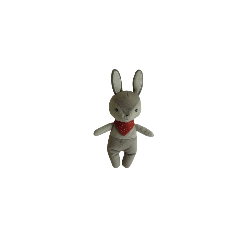 Doudou peluche lapin 26 cm environ oreilles comprises, gris banda rouge à pois. Etat : Comme neuf (des étiquettes ont été coupé, il en reste une)Recipient :