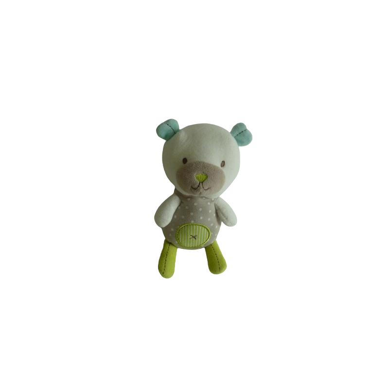 Doudou peluche ours 23 cm environ, blanc vert taupe motif pois. Etat : Comme neufRecipient :