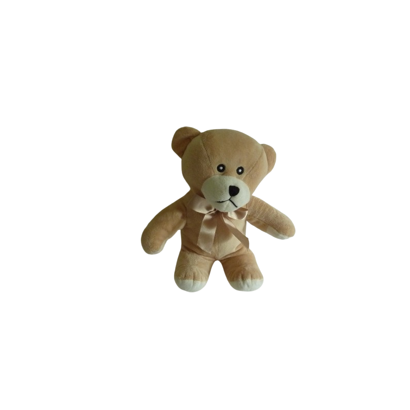 Doudou peluche ours 28 cm environ position assise, marron blanc nœud satin au cou. Etat : Comme neuf