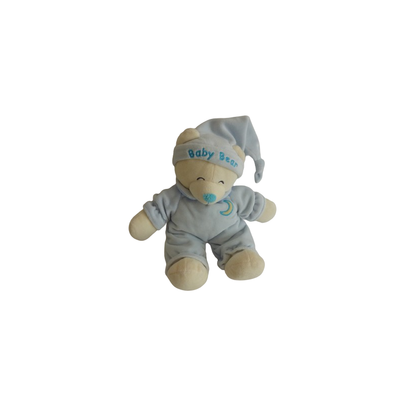 Doudou peluche ours 29 cm environ sans compter le bonnet, bleu écru. Etat : Comme neufRecipient :
