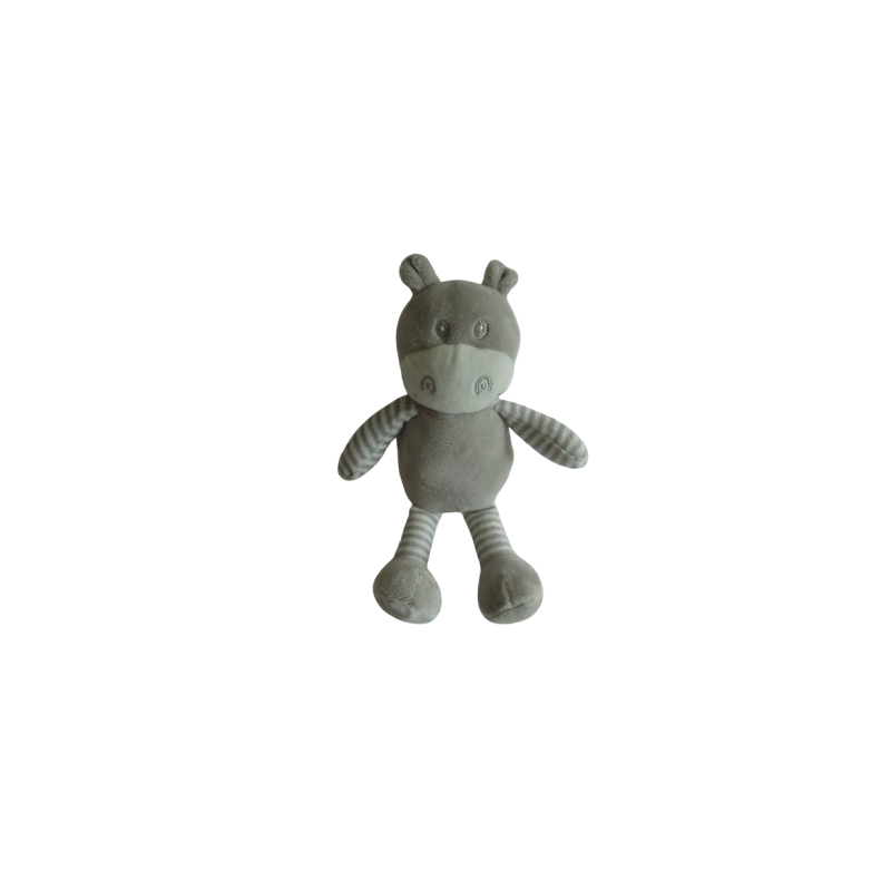 Doudou peluche hippopotame 24 cm environ, gris blanc rayures. Etat : Comme neuf