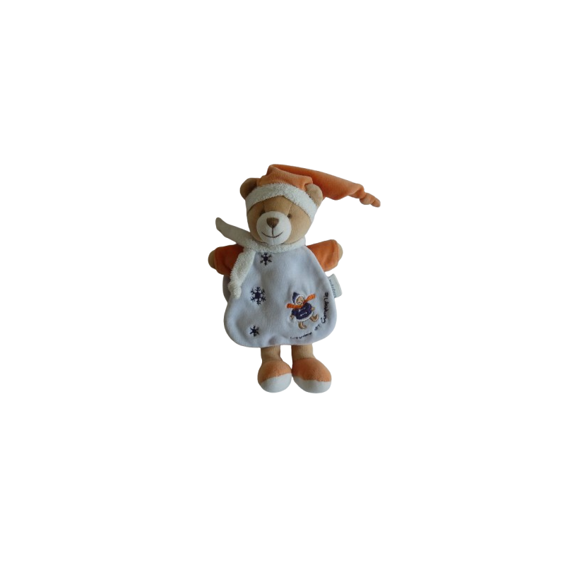 Doudou peluche ours 23 cm environ sans compter le bonnet, cape bleu, orange marron. Etat : Bon état (quelques marques d'usures légères)Recipient :