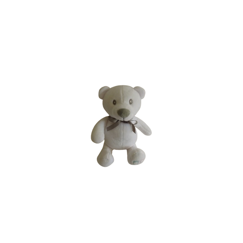 Doudou peluche ours 24 cm environ, blanc et et nœud gris. Etat : Comme neuf