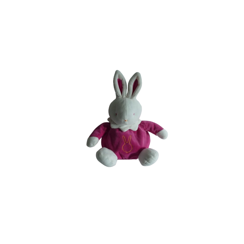 Doudou peluche lapin 27 cm environ oreilles comprises, fushia blanc tête lapin brodé en orange sur le ventre. Etat : Comme neuf (étiquette marque coupée)Recipient :
