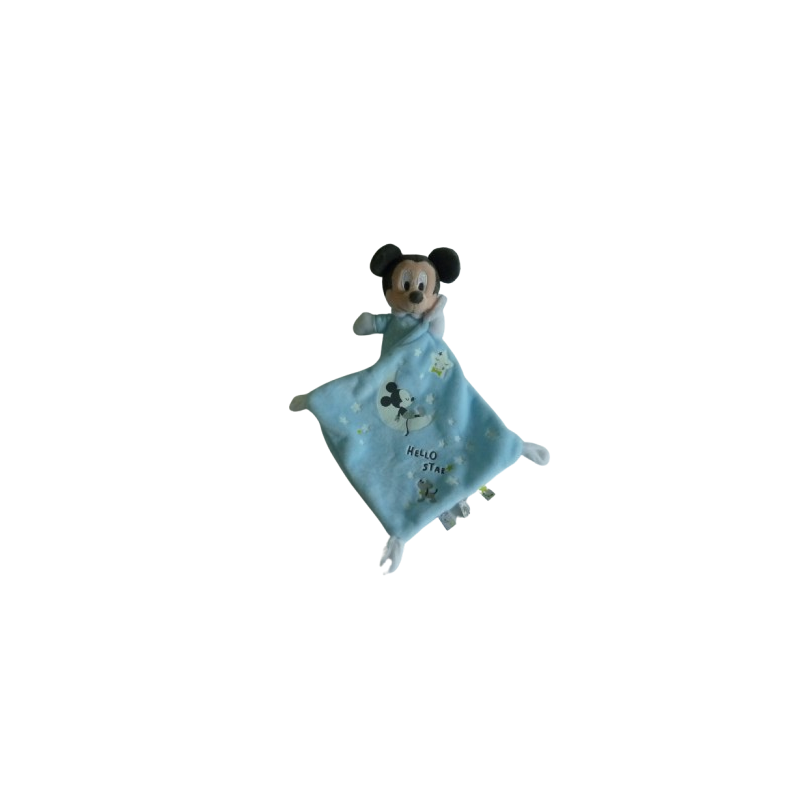 Doudou peluche Mickey 16 cm environ, bleu motif étoiles, mouchoir : 20x20 cm environ : bleu motif étoiles lune Mickey Pluto Hello Star. Etat : Comme neufRecipient :