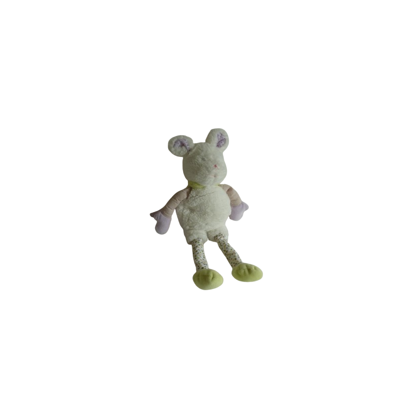 Doudou peluche souris 33 cm environ sans compter les oreilles, blanc motifs. Etat : La peluche est en parfait état mais il manque l'écusson au cou et étiquette marque coupéeRecipient :