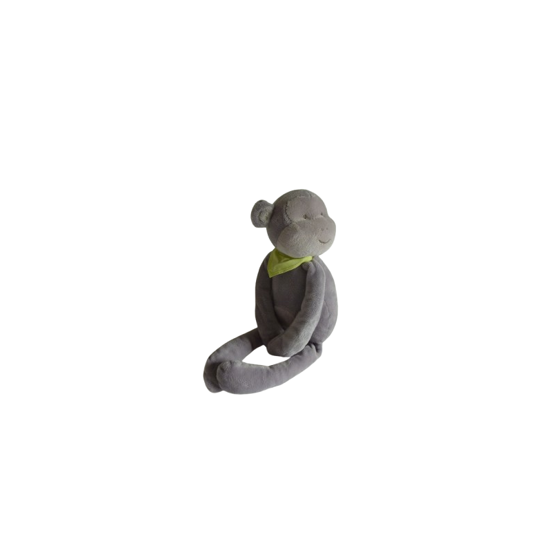 Doudou peluche singe 44 cm environ, gris écharpe verte, velcro aux pattes. Etat : Comme neuf (pas de couverture)
