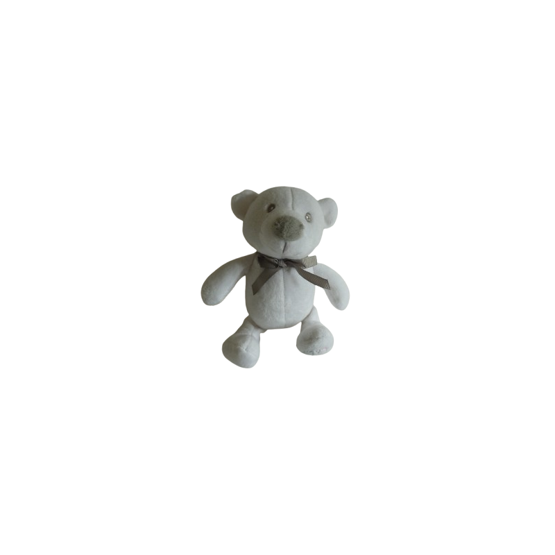 Doudou peluche ours 21 cm environ, blanc et et nœud gris. Etat : Parfait étatRecipient :