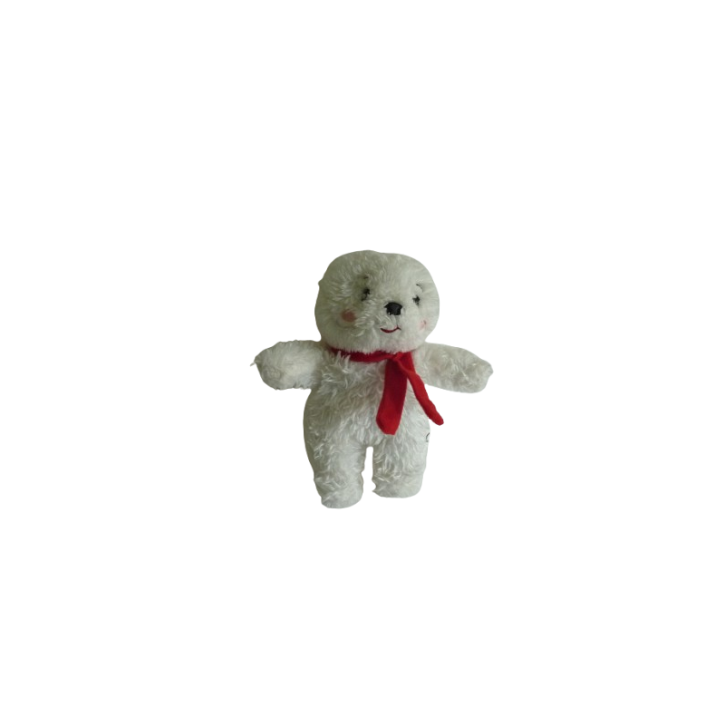 Doudou peluche ours 21 cm environ, blanc écharpe rouge. Etat : Très bon état (matière sur le nez effacé)Recipient :