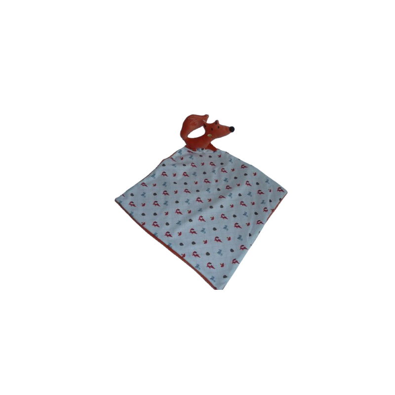 Doudou peluche renard 15 cm environ de large grelot orange blanc à motifs, mouchoir 33x33 cm environ orange et blanc à motifs. Etat : NeufRecipient :