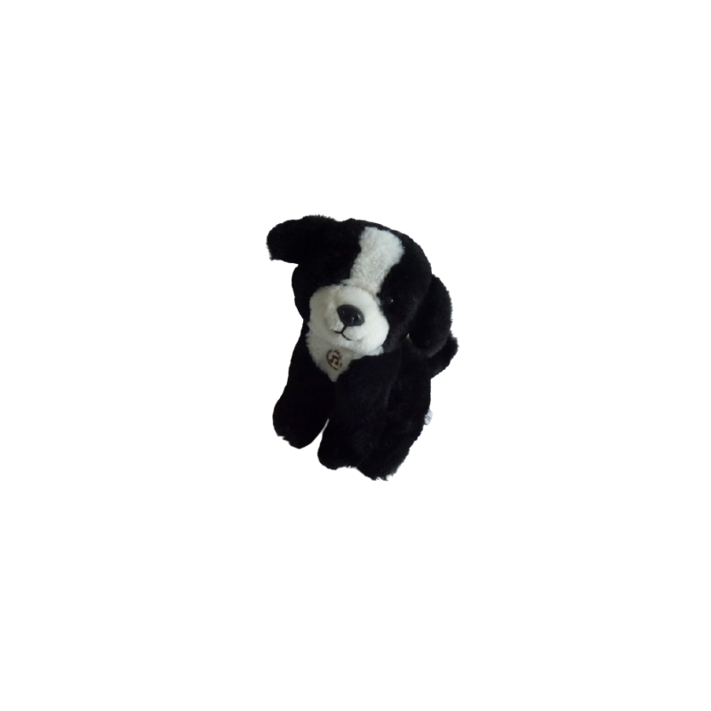 Doudou peluche chien position assise 20 cm environ de hauteur, noir blanc, petit son lorsqu'on appuie sur le torse. Etat : La peluche est en parfait état mais le son lorsqu'on appuie sur le torse ne fonctionne pas toujours.Recipient :