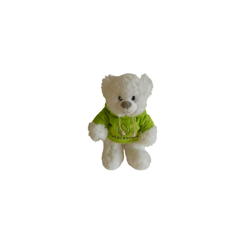 Doudou peluche ours 30 cm environ, blanc tshirt à capuche vert fluo. Etat : Comme neuf (étiquette marque coupée)Recipient :