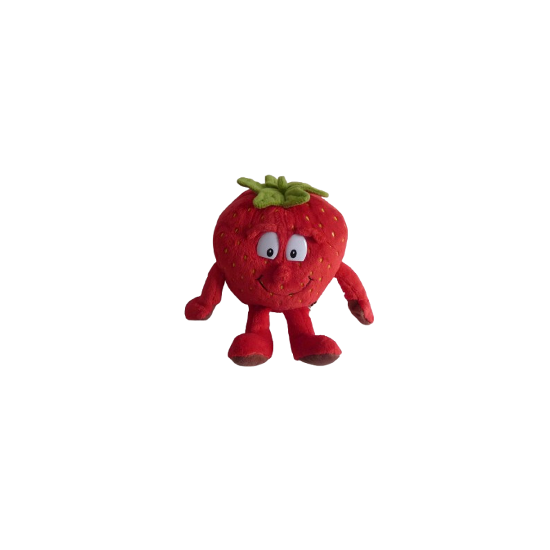 Doudou peluche boule fraise 25 cm environ, rouge vert. Etat : Parfait état (griffes sur un œil mais rien de méchant)Recipient :