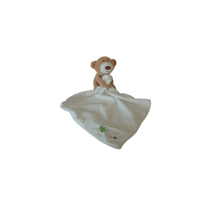 Doudou peluche ours 16 cm environ, marron blanc , mouchoir blanc 29x29 cm environ motifs cœur vert et coccinelle. Etat : Comme neuf (pas d'étiquette de la marque)Recipient :