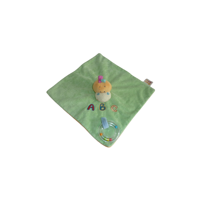 Description du doudou : Doudou plat canard 28x28 cm environ, anneau à grelot, vert orange motif ABC. Doudou super doux. Etat : Très bon étatRecipient :