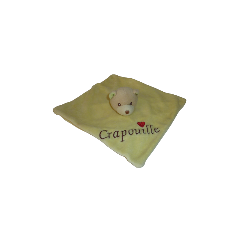 Doudou plat ours 23x23 cm environ, jaune Crapouille et cœur rouge brodés. Etat : Comme neuf