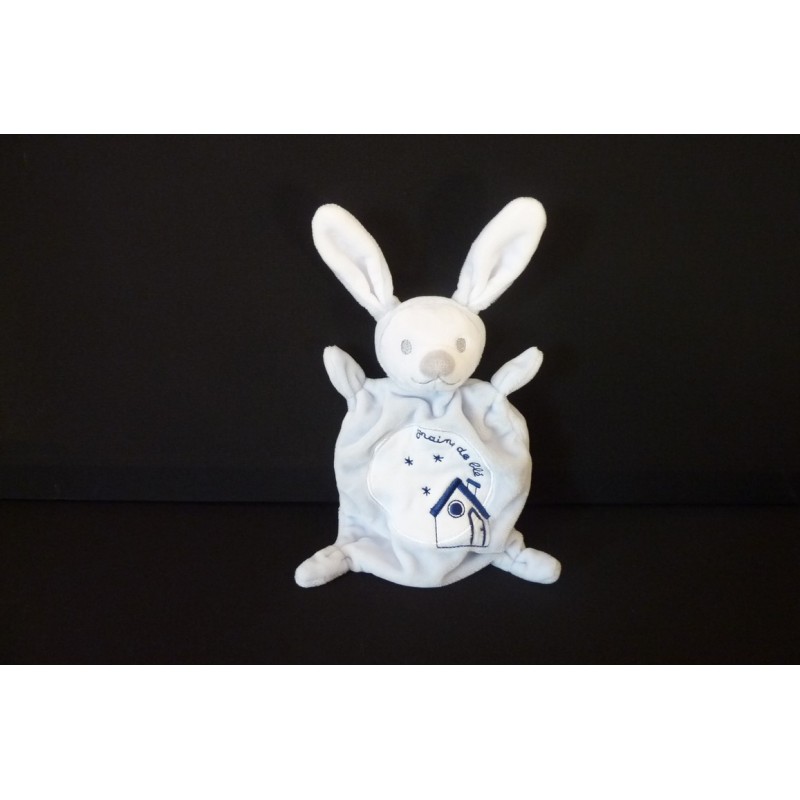 Description du doudou : Doudou plat lapin. Coloris : bleu, motif maison. Doudou super doux. Etat : Comme neuf. Produit original. DOUDOU DIFFICILE A TROUVERRecipient :