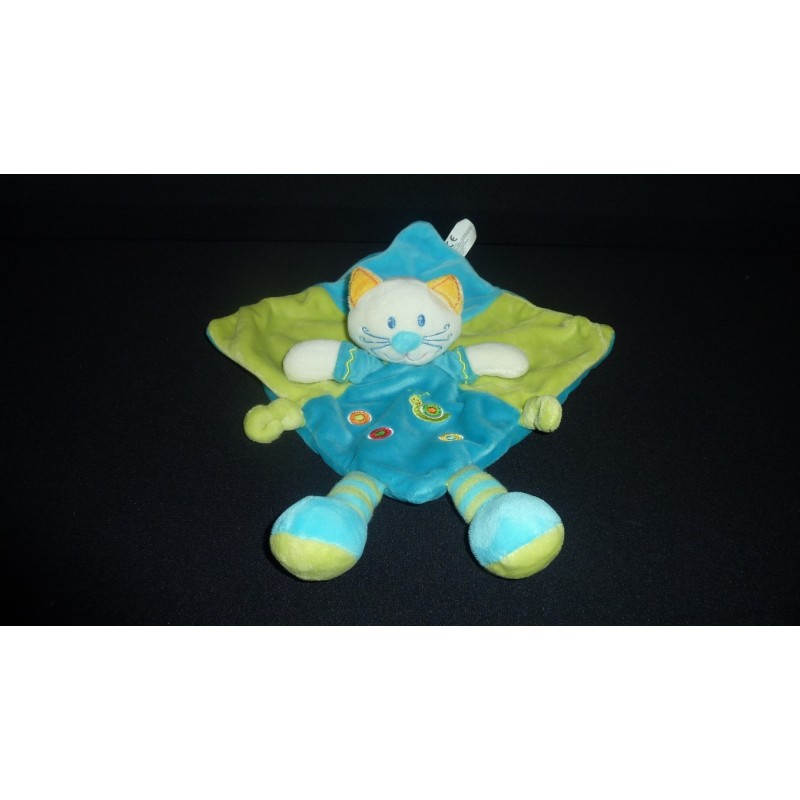 Description du doudou : Doudou plat chat, 2 petits nouages, ronds, escargot brodés. Coloris: turquoise, vert. Doudou super doux. Etat : Comme neuf, produit original.Recipient :