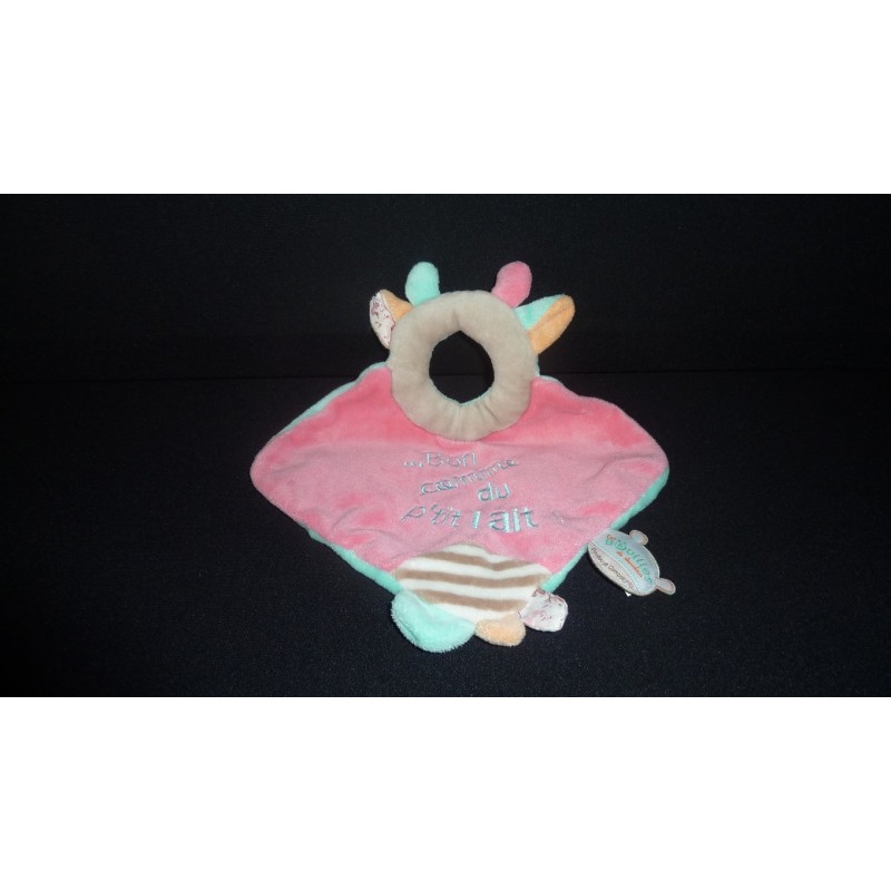 Description du doudou : Doudou plat vache, Bon comme du p'tit lait brodé, matière bruissante. Attention modèle sans tête. Doudou super doux. Etat : Neuf sans étiquette boutique, produit original.Recipient :