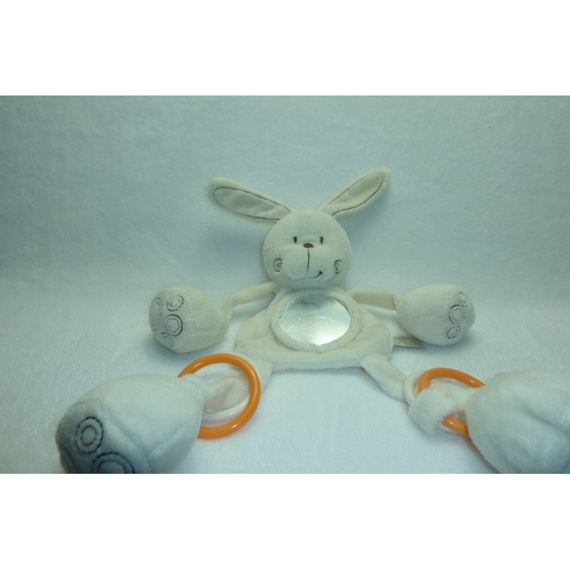 Description du doudou : Doudou plat lapin : anneau, pouet pouet,miroir. Coloris : blanc écru, ronds spirales brodés. Doudou super doux. Etat : Très bon état (miroir griffé). Produit original. DOUDOU DIFFICILE A TROUVERRecipient :
